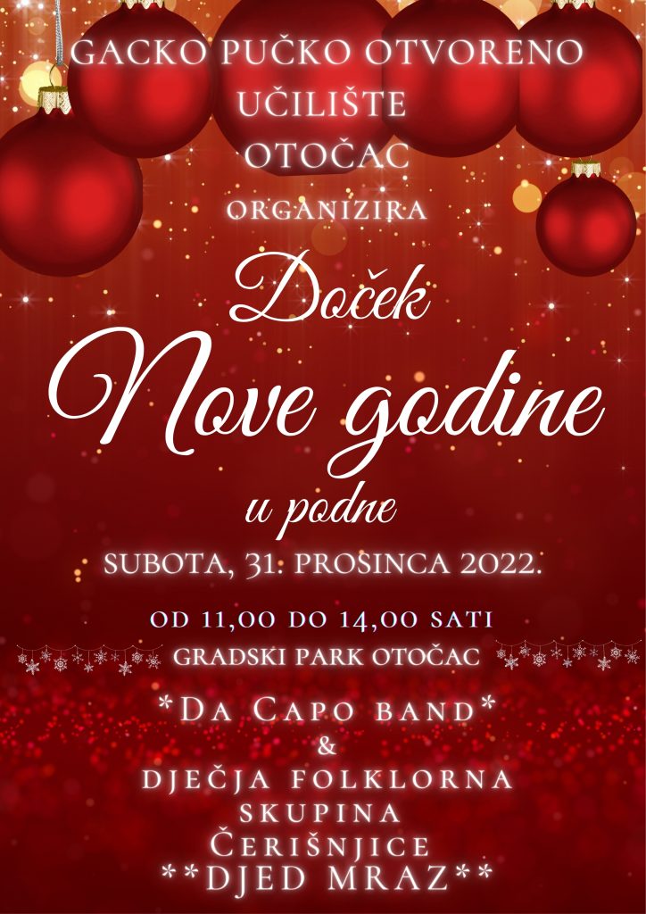 Gacko pučko otvoreno učilište Otočac i ove godine organizira doček Nove godine u podne. Doček za najmlađe, ali i one malo starije, održat će se 31. prosinca u gradskom parku u Otočcu, u periodu od 11 do 14 sati, a posjetitelje će uz poklone za najmlađe zabavljati Da Capo band i dječja skupina Čerišnjice.