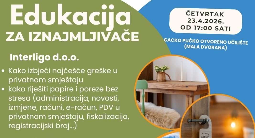 Edukacija će se održati u maloj dvorani Gackog pučkog otvorenog učilišta Otočac u četvrtak 23. travnja 2026. s početkom u 17:00 sati. Edukacija je besplatna za sve zainteresirane iznajmljivače kao i one koji to tek žele postati ali i sve ostale nositelje turističkih ponuda.